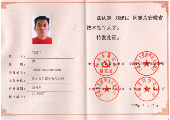 2018年1月22日,我司總經理劉建民被認定為安徽省技術領軍人才。