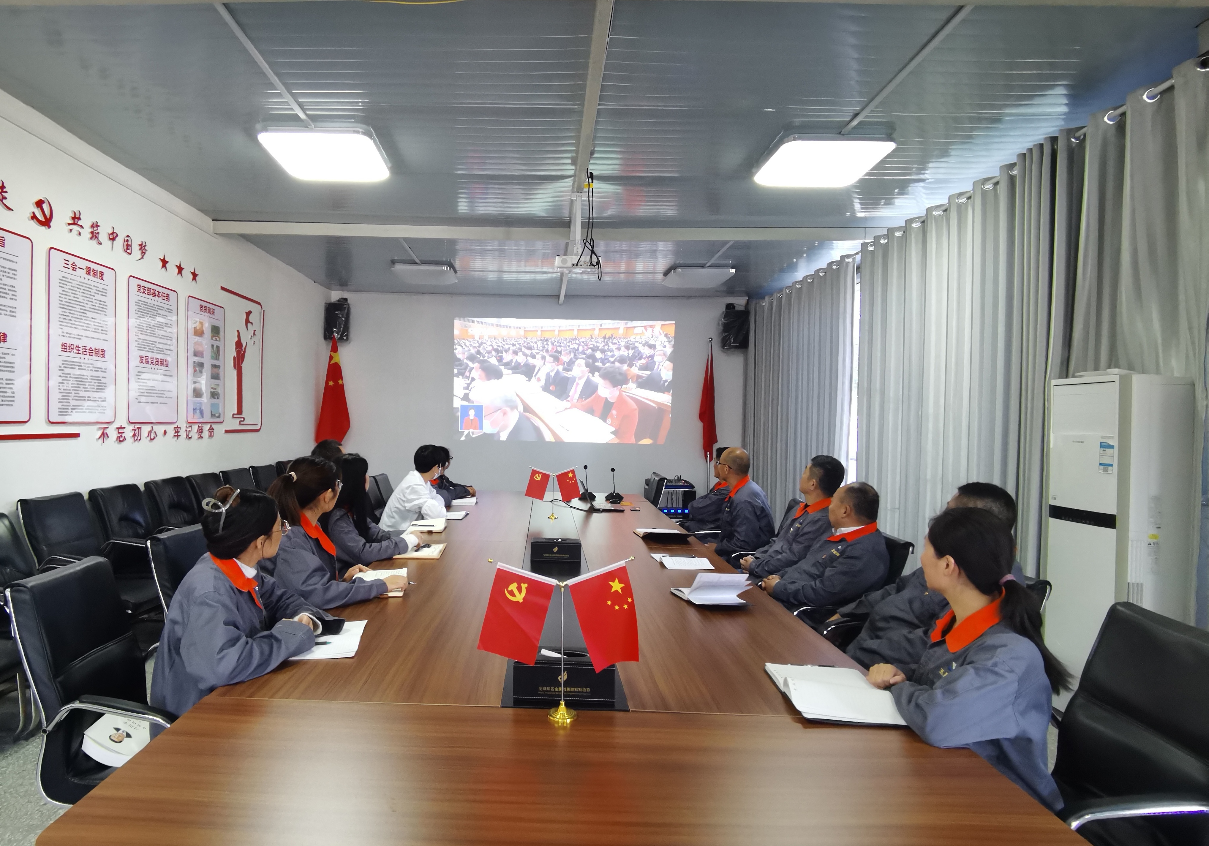 在黨支部書記李自林的帶領下,大家都身著工裝,帶上黨徽懷著激動的心情正襟危坐,認真觀看,聽著習總書記堅定充滿力量的